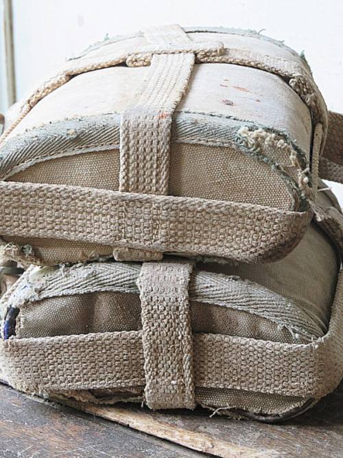 Emaillen veldflessen met hand gestikte canvas voering.