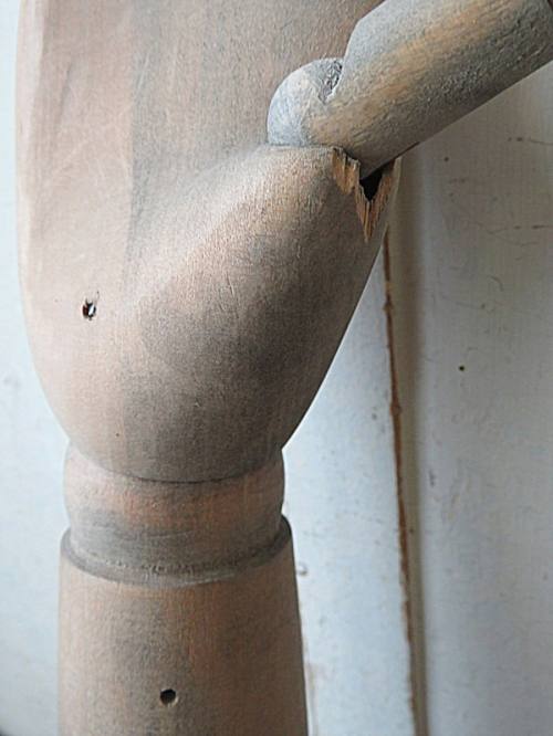 1 hand heeft lichte schade, klein stukje van het hout en een gespleten stukje bij de pink.