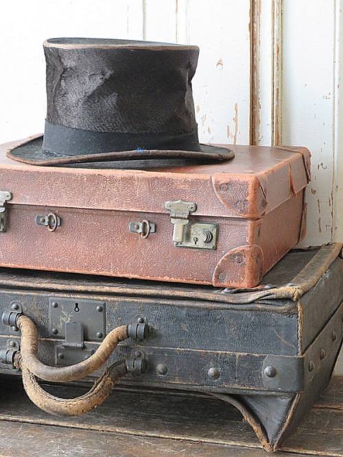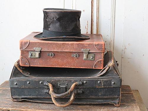 Twee shabby koffers en een hoge hoed.