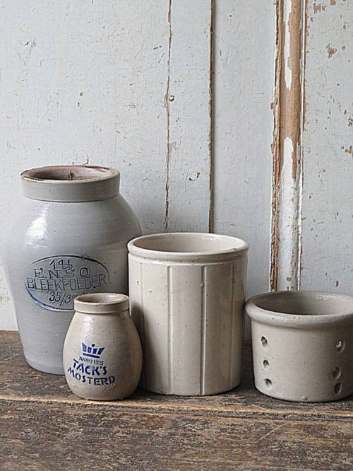 Bleekpot 15 cm, mosterdpot 7 cm, marmeladepot 10 cm, kaaslekpotje 6 cm.