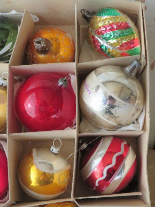 VERKOCHT 943. doosje oude ballen en ornamenten