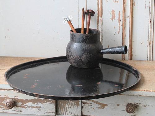 Zwart emaillen met roest plekken.