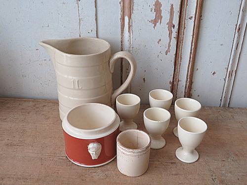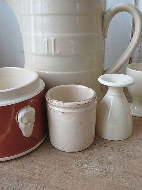 Bleekpot 15 cm, mosterdpot 7 cm, marmeladepot 10 cm, kaaslekpotje 6 cm.